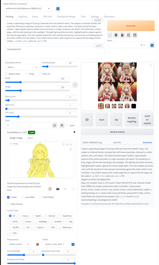 ちなみに、既存キャラクターなのでプロンプトに名指ししてみたバージョンもあるけど、色設定は反映されませんでした。モデルとして利用されていそうな巨大ジャンルなら再現できるのかな。