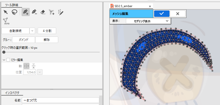 Live2Dメッシュが粗い可能性があるので、「メッシュ編集 > 4分割」ボタン押下でメッシュ割を細かくする。