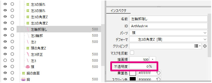 - 「輪郭を隠す」パーツの不透明度を0%にする