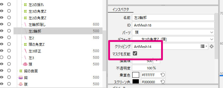 - 「輪郭」パーツにて「輪郭を隠す」パーツのIDをクリッピング欄に入力、「マスクを反転」にチェックをいれる